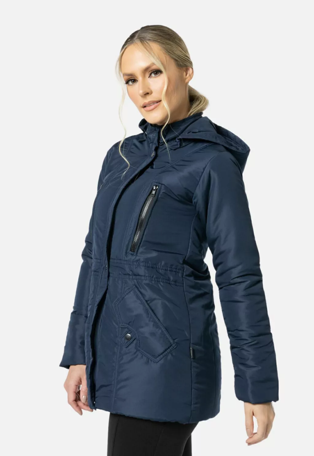 Casaco Carbella com manta interna acolchoada de microfibra 8mm, fecho por zíper e botões.