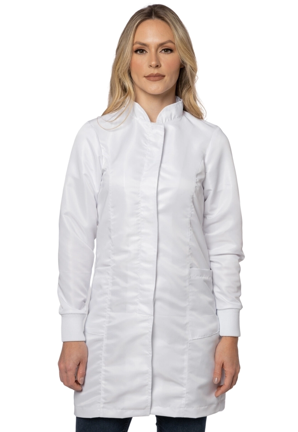Descrição: Jaleco feminino gola padre manga longa 2 bolsos tecido Gabardine com punho.